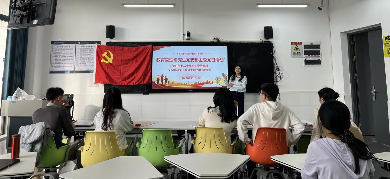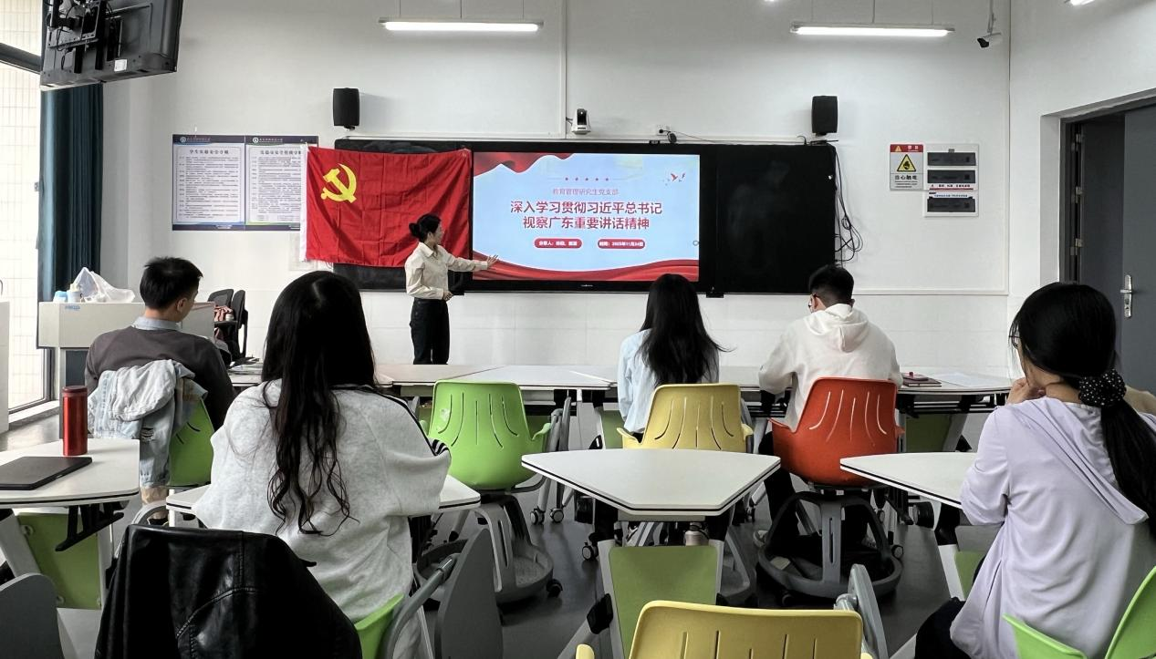 为深入学习贯彻习近平总书记视察广东重要讲话精神与党的二十届四中全会精神,推动理论学习与教育专业实践深度融合,切实强化支部党员及入党积极分子的责任担当与专业素养,11月24日上午9点,教育管理研究生党支部在白云校区第二实训楼307教室成功举办11月主题党日活动。支部全体党员出席、入党积极分子积极参与,活动由教育管理研究生党支部副书记卢凯敏同志主持,通过第一议题领学、主题研讨交流、实践经验分享三个环节,实现思想淬炼与能力提升的双向赋能。
