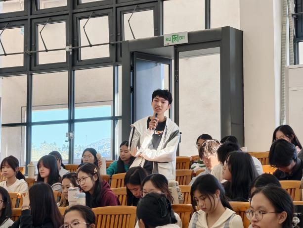 在随后的互动环节,同学们围绕亲和力提升、职业惰性克服、科研开展、行业前景等问题踊跃提问。各位老师结合自身经验与政策背景,给予了细致解答。廖琳静副园长强调“在真实问题中寻找科研起点”,李雪曼老师建议“从孩子的笑脸中汲取温暖与力量”,林丽君老师则鼓励大家“沉淀自我、提升核心竞争力”。现场交流深入,氛围热烈。