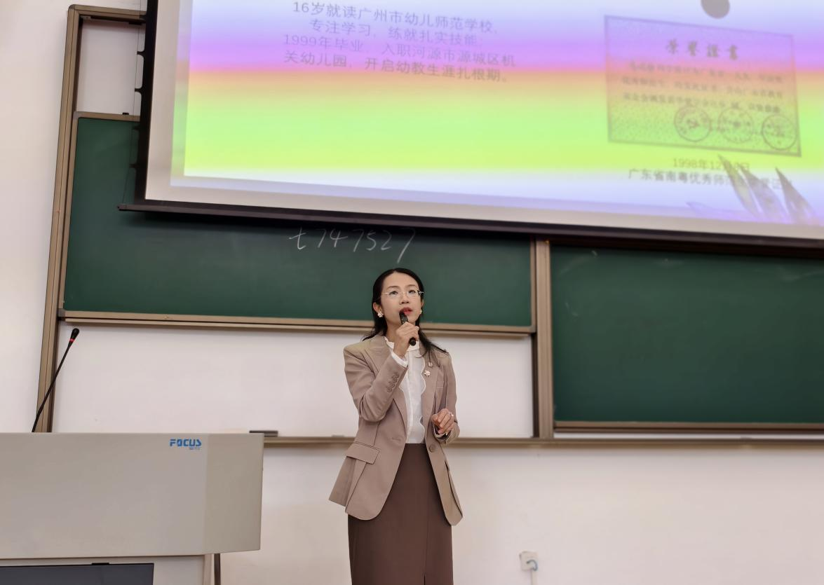 紧接着,拥有19年从教经验的李雪曼老师以“前方有光,初心不改——我的幼师成长之路”为题,分享了她温暖而坚定的教育故事。李老师通过丰富的活动实录视频,展示了如何在一日活动中观察、支持幼儿发展,并深情回顾了她与孩子们共同成长中的“爱与被爱”“倾听与合作”。她坦言,幼教工作虽繁琐,却带来了无可替代的职业幸福感与人生意义,让学子们深切感受到这是一场“生命影响生命”的温暖旅程。